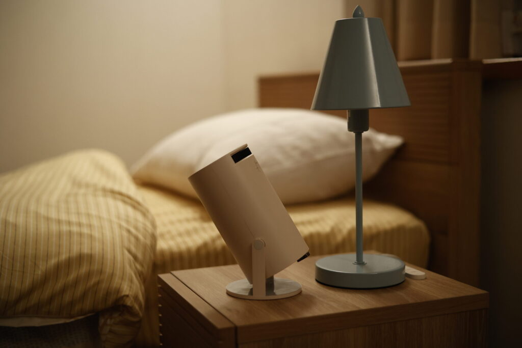 プロジェクターと言えば、「白くて大きな箱!」のイメージが強いですが、Astrum はオシャレなベージュで小さな筒形。500mlペットボトルを一回り大きくしたようなサイズです。