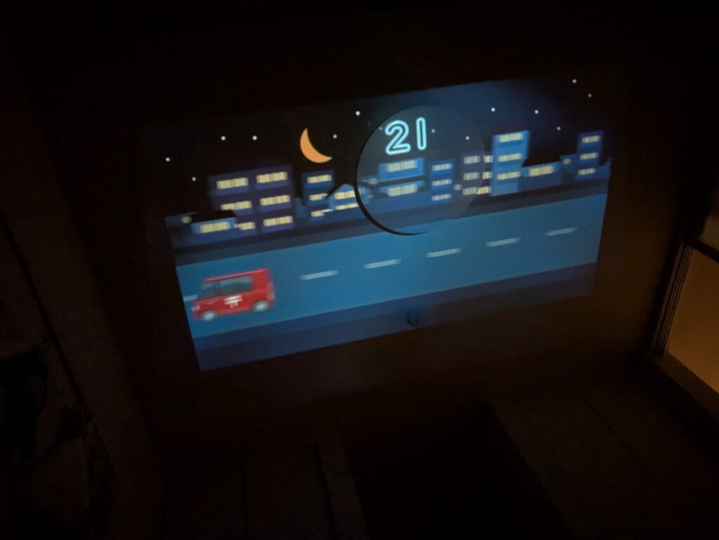 真っ暗闇はあまり好きではない娘なのですが、暗くすることで画面が鮮明に映るので、暗い寝室に喜んで入ってきて、画面が見やすいベストポジションであるお布団の中まではスムーズに来てくれるようになったかなと感じています。