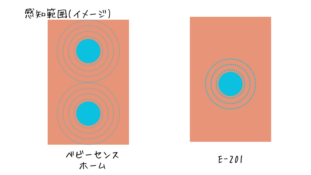 ベビーセンスホーム等の比較的お高めの商品は、2枚のパネルで広範囲をカバーしますが、E-201の検知範囲は1枚のパネルが届く部分のみです。
