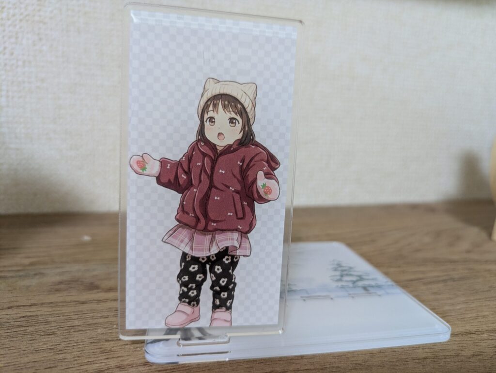 人のイラストと風景のイラストをアクリルグッズにしたところ、どちらも作成時のままの色味がしっかりと再現されていました。