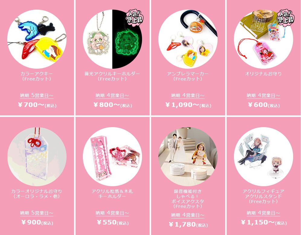 グッズの種類が本当に豊富なので、通常のアクスタ・アクキー作成から一歩進んだアイテムの作成ができます。