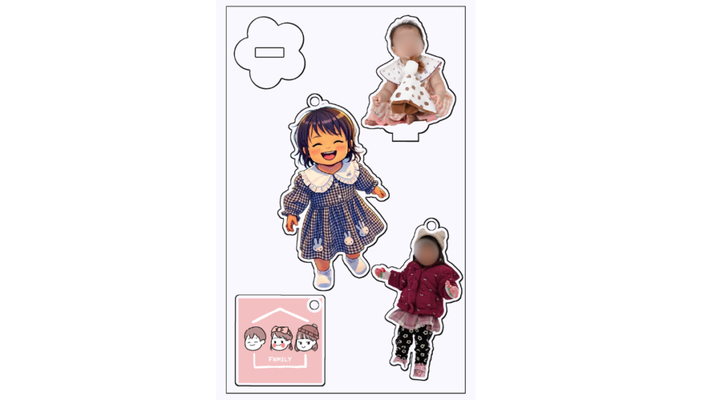 子供の月齢フォトの姿を1枚のプレートに敷き詰めてのキーホルダー作成や、捨てる前のお洋服や育児グッズをアクリルグッズにして省スペースで保存したりと工夫次第で様々な商品が作成可能です。