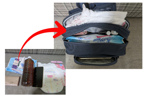 オムツやおしりふきを常時入れて、ある程度クッション要素を確保することをオススメします。