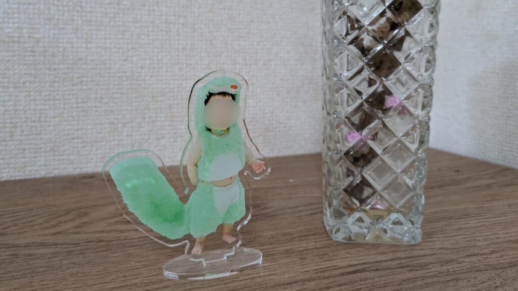 子供やペットの写真は「写真たてに入れて飾るもの」と思っていましたが、アクスタにすることでインテリアとしても映えるようになりました。