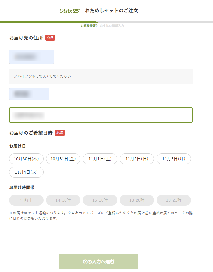 注文ボタンをクリックすると、お届け先となるあなたの情報を入力する画面に移ります。